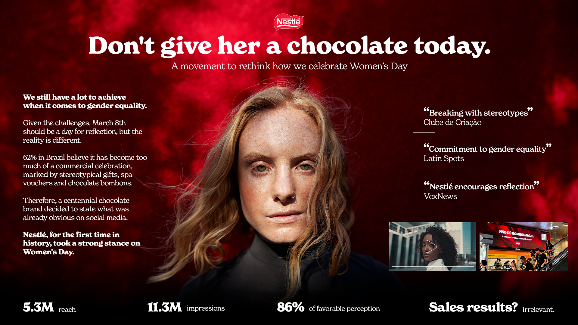 No país do chocolate, a Nestlé decidiu não vender bombons no Dia da Mulher. Pela primeira vez em sua história, a marca se posicionou com coragem para questionar o estereótipo: por que presentear com chocolate um dia que deveria ser de reflexão?